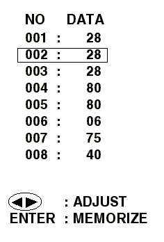 Клавиша PICTUPE ADJUST выбирает позицию, а клавиша PICTUPE ADJUST +/- изменяет значение. Для запоминание установок нажмите на кнопку OFF TIMER. Для возврата к нормальному экрану два раза нажмите клавишу MUTE.
